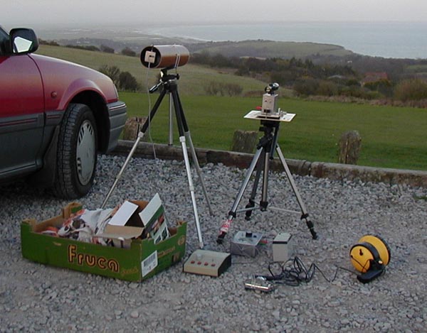 Laser Record - 49.3 km ContactG8LSD G0MRF's Laser equipment at FairlightDavid Bowman G0MRF and myself (Allan Wyatt G8LSD) have conducted tests over the last four months with Derek Atter G3GRO and Lech Laszkiewicz G3KAU. The distances have developed from a few tens of metres to 20 km, then 40 km and finally on Saturday, 5th April,2003 to 49.3 km. The path being from Fairlight east of Hastings to Capel le Ferne east of folkestone. The distance was verified by using the G4JNT software. Semiconductor lasers operating at 670nM were used at both ends: 3mW to a beam expander at the G8LSD end, and 10mW 'barefoot' at the G0MRF end. Both receivers were designed independently and operated at audio baseband without a carrier. 488Hz tones were generated in the transmitters for modulating the lasers by the dividing down of a crystal oscillator. Keying of the tone providing the CW. Both receivers featured audio filters to reduce bandwidth. I used a TimeWave DSP filter and David used a home brew op-amp based filter peaking on 488Hz With the 40km path showing very significant scintillation of the signal, we had also taken laptop computers so that very slow CW could be sent and received to overcome any scintillation. In the event the audio was clear enough to read without additional aids. Each station had separate RX and TX equipment. G0MRF used a purpose built telescope around a 100mm lens to gather light on receive and I used a Russian 4.5 inch reflector telescope and swapped the eyepiece for the detector head. Both transmitters used tripod bases with vernier adjustments mounted above. Finally the transmitter mounted on the vernier mechanism. Aiming of the laser was by rifle sight secured to the TX housing. Strong and very cold winds worked against long term holding of the beam position, but even when the laser dimmed from the brightest light in the sky to only just visible with binoculars, the signal remained audible. We arrived on site at 18:30 UTC and saw a good sunset but no view, it was quite misty. The power station at Dungeness some 30 km away disappeared completely by 19:00 UTC. By 21:25 we had a sighting of the powerful white lights used for aiming as a dim yellow disc. The laser was aimed at the disk and at 21:30 the laser was switched on. G0MRF received the signal immediately and within a few minutes we had both systems aligned. Reports of 559 and 579 as well as both callsigns and additional characters were exchanged by 21:45. In spite of wearing fleece lined trousers, a sweatshirt, two fleeces and a cagoule, as well as walking boots, it took me several hours to warm up after the event. My long suffering wife, (daughter of G3JMB) and I celebrated 29 years of marriage the following day. On the way home on Saturday, at just after midnight, she expressed that she had been engaged in some daft radio expeditions in her life but nothing so stupid as standing on a clifftop in a bitingly cold wind in the pitch dark for three hours. Updated 18 OCT 2003 Return to Main Page |