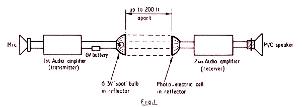As will be noted from the diagram at Fig. 1, the 6.3 Volt bulb is mounted in one reflector connected in the output of the first, or Transmitter Amplifier, whilst a photo-electric cell, almost any type, or a photo-transistor OCP71, is mounted in the other reflector. Output from the PE cell is, of course, fed into the grid circuit of a second or Receiver Amplifier, output then being taken in the normal way through a moving coil speaker.