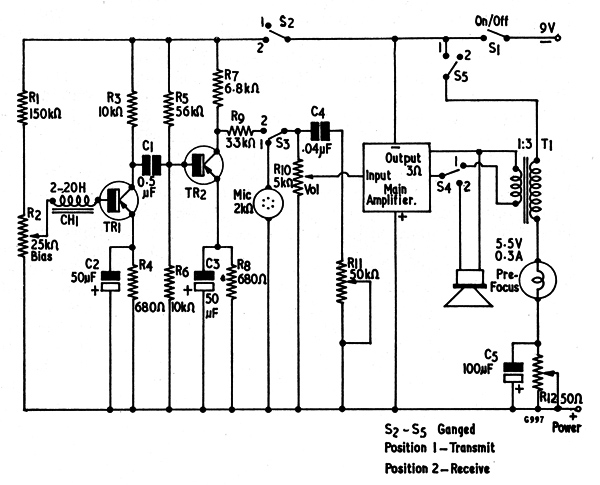 The circuit of the transmitter-receiver is given in Fig. 1. In this diagram, switches S2 to S5 are ganged, providing Transmit on Position 1, and Receive on Position 2.