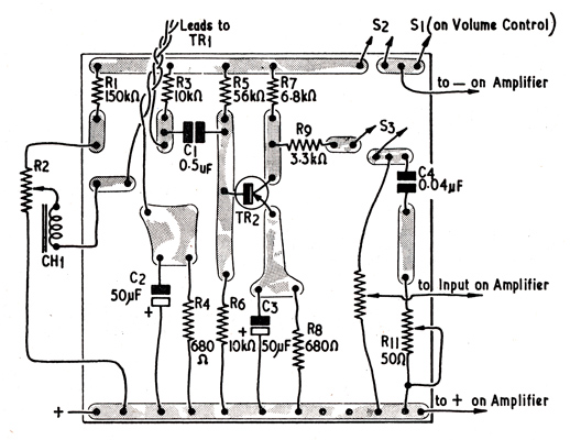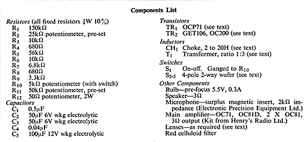 When S2-5 is set to Position 1, the phototransistor and pre-amplifier are switched out of circuit and the microphone is coupled to the volume control R10, the slider of which connects to the input of the main amplifier. This latter employs the line-up, OC71, OC81D and two OC81’s, and offers an output of 500mW or more. It was obtained as a kit from Henry’s Radio Ltd.