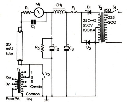 Points to watch while setting up the equipment is that the power amplifier is not grossly overloaded, and that it does not become unstable. An oscilloscope is invaluable for modulation tests, but if one is not available an output meter may be connected to the PA output to monitor signal level and check for self-oscillation. A useful pointer to overloading is when the modulation transformer starts to sing loudly: another is the fluorescent tube itself. When over-modulation occurs the tube will flicker. At normal levels of modulation the flicker is scarcely perceptible.