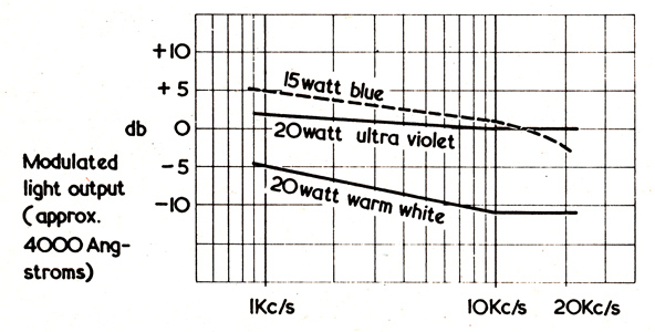 With the fluorescent tube coupled to a suitable modulation transformer driven by a valve amplifier, the overall un-corrected frequency response was plotted as shown in Fig. 1, and was within 3dB from 40 kHz to 4 kHz. Although this response is much better than that obtained with torch bulbs and a 15 Watt mains bulb, and is adequate for speech communication, it was thought that better results were possible.