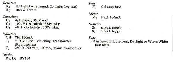 It will be seen, in Fig. 2, that the fluorescent tube is directly modulated by the transformer T1, and that the tube starting heaters are not used. After switching on the equipment the tube will strike on a high level audio peak, attaining full brightness almost immediately. Dropper resistor R1 limits tube current which is monitored by a 100mA meter, to a safe value, and it may be adjusted to suit the fluorescent tube and supply voltage. The correct value of resistor will lie within the range 1kΩ to 3kΩ (start with the high value and reduce this until the desired results are obtained). On no account should the tube ever be connected straight across the 250 Volt DC supply, as this will quickly ruin the tube, and could have spectacular if short-lived results. Capacitor C1 presents a low impedance path to the AC drive which is developed across the secondary winding of the modulation transformer.