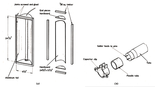 The large piece of hardboard forming the body of the reflector is first soaked in a bath of hot water for about an hour to make it pliable. It is then bent roughly to shape and the end pieces are held in place with several windings of string. String is also spirally wound along the body to hold the sides in, and the whole is left to dry. All joints are then screwed and glued and the timber frame is fitted. Details of the tube mountings are given in Fig. 4 (b). Electrolytic capacitor clips were employed to grip Paxolin tubing, into which the fluorescent tube was then fitted. Finally, a layer of bright cooking foil is glued and smoothed on to the reflector body, and the wood frame and hardboard externally painted.