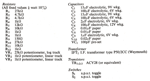 The ACY28 transistors specified for Fig. 6 may not be a familiar type to the readers. The ACY28 is a general purpose audio transistor with a cut-off frequency of 1.2 MHz, a power rating of 200mW in free air, and an hfe of 45 to 150. It can be obtained from either STC Electronic Services, Edinburgh Way, Harlow, Essex, or Henry’s Radio Ltd., 303 Edgware Road, London, W2. ACY28 transistors are also used in the receiver section.