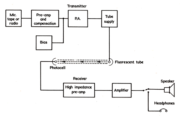 The block diagram of Fig. 8 shows the complete Photophone installation. In this diagram, the pre-amplifier of Fig. 6 precedes the transmitter power amplifier, this coupling into the tube power supply and, thence, to the transmitting fluorescent tube. At the receiving end, the modulated light is picked up by a photocell, the resultant signal being passed to a pre-amplifier, a main amplifier, and a speaker or headphones. An overall compensated response curve is given in Fig. 7.