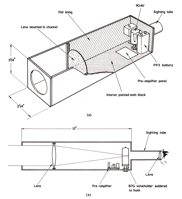 Recourse was again made to that useful material, hardboard, in the construction of the receiver. See Fig. 12. Undoubtedly an aluminium box would be better, but hardboard allows quick fabrication of prototypes and can easily be made light-tight. The box also forms the lens tube or collimator.