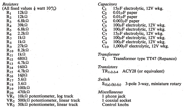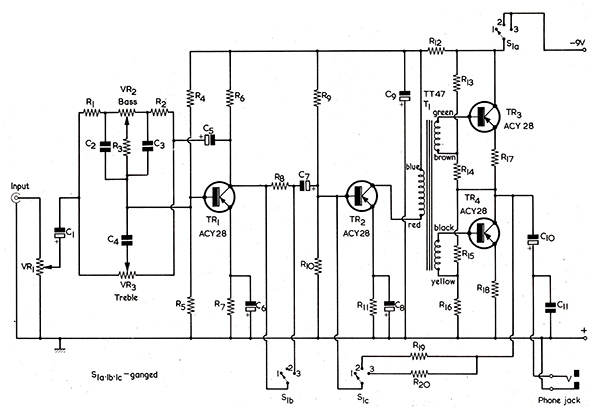 Construction could take many forms. The prototype portable amplifier consisted of two small panels, one containing all the components associated with TR2, TR3, and TR4, and the other those associated with TR1. Both panels were mounted in a small plastic box, together with battery, switch, tone controls and volume controls.