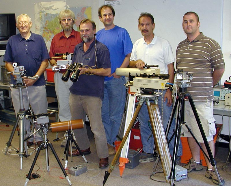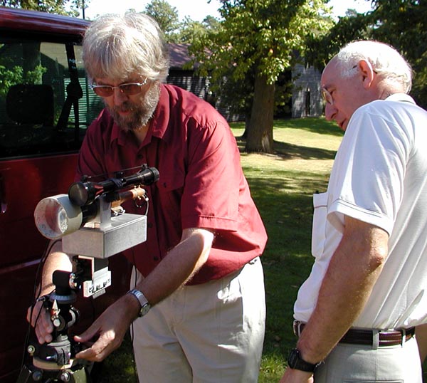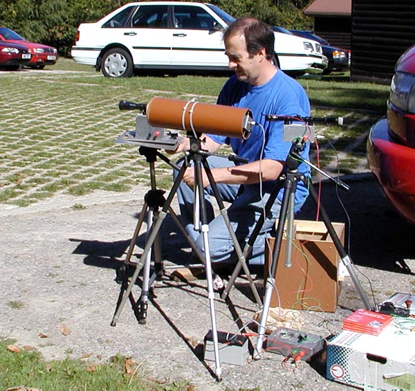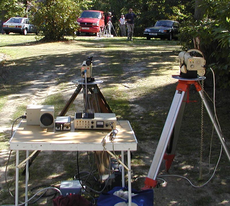 Crawley Microwave Round Tableby Chris Whitmarsh G0FDZ Laser equipment and operators. From left to right: Derek G3GRO, Allan G8LSD, Nick G4ACW, David G0MRF, Chris G0FDZ, John G7JTTAt the Crawley event in 2002 there was some discussion that showed that a number of those present were interested in lightwave communication. With that in mind, it was decided that the theme for this years round table would be lightwave (laser) communications, and what a success it turned out to be. Around twenty five microwavers attended the event at the Crawley Radio clubs QTH, attendees included several people who weren't strictly interested in microwaves but came along because they too were interested in laser communications. Activity outside the Crawley clubhouse. G0FDZ's ststion in the foreground with G8LSD by his red VW minibus (mobile shack)During the morning period, the weather being pleasant, a number of lasers systems were set up outside the hut and much testing and short range QSO's resulted. It was extremely pleasing to have the chance to chat and exchange ideas with other 'lightwavers', where previously a number of us had been working in isolation and had never met up before. Allan G8LSD with Dave G6KIEAlthough most of the systems shown used lasers (both solid state and helium/neon), there were some interesting transmitters using stacks of LED's. Discussion also centred on the practicalities of laser alignment over long paths, and also the pro's and con's of various modulation methods with a number of ideas presented. David G0MRF with his record breaking laser station.So far, the majority of laser contacts have taken place during the hours of darkness, but the use of optical filters allowing possible contacts during daylight were mentioned, but these tend to be very expensive with narrow bandwidths giving compatibility problems between different frequencies of red- light solid state and gas lasers. I think that nighttime operation will continue to be the norm for the foreseeable future. After lunch, the first talk was by Chris G0FDZ on 'Laser Comms - The simplest approach'. Chris showed his laser system built back in the 80's using a Maplin helium/neon laser. The transmitter uses a beam chopper to create a modulated beam, and a solenoid optical shutter, which could be keyed to produce a simple CW transmitter. He also incorporated a simple AM modulator for speech that would give low-level modulation at around 10%. On receive, Chris had a choice of two detectors, the first is a simple photo-PIN diode system, and the second uses a photo-multiplier. A four-inch diameter lens provides the light gathering optics. Allan G8LSD followed on with a talk on more advanced systems, one of which he had used earlier in the year to cross the English channel, and also to make the UK record of 49kms. He presented a simple cheap transmitter option using a laser level obtainable from B&Q and other retailers. His main system uses a solid-state laser and beam collimator combination, and pulse width modulation for speech. An 488Hz tone is available for CW keying. On receive, Allan uses an OPT211 detector and a Russian astronomical telescope for the optics. See here for pictures The use of a cheap strobe, directed at the distant station to pinpoint his exact location, allows the time taken for the alignment of the lasers to be greatly shortened, and for receiver checking both locally and at the distant end. Some discussion was made with regard to propagation in various weather conditions, bearing in mind experiences gained when crossing the channel, and the possible usage of DSP techniques such as those already used to great effect on 137kHz. Just to ensure that microwaves were not forgotten, Derek G3GRO talked about his new 23cms masthead mounted system that he used successfully during the recent VHF NFD. The system produced an impressive 80 watts easily. This event has surely to be the largest gathering of UK laser enthusiasts so far, with six lightwave operators with working systems, and a number of others who departed the event with various laser and optical components in hand sufficiently enthused to have a try themselves. Many thanks to Derek G3GRO and the Crawley Radio club for organising this event. Sufficient interest in lightwaves has been generated, that the idea of organising a 'Lightwave Round Table' early in the New Year now seems to be likely. Held on the 1 SEPT 2003 Return to Main Page |