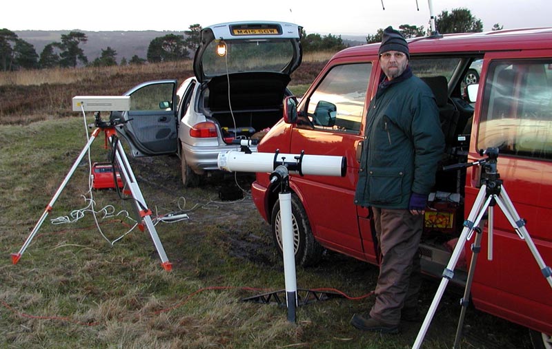 24th January 2004. The temperature was just above freezing and we were setting up for the first series of tests of the year. I am not as large as I look in the picture, you just pay a visual price to stay warm for a four hours when standing still. You can also see G0FDZ's new laser transmitter.