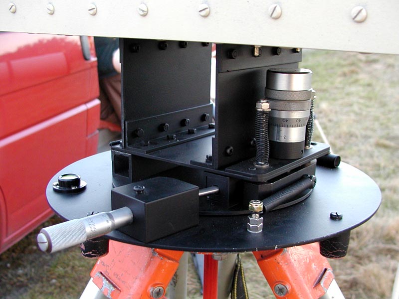 24th January 2004. G0FDZ's new laser transmitter on its first outing. Shown here are the micrometer adjusters for both azimuth and elevation. Even with such excellent engineering the alignment setting was critical. Note the springs to eliminate backlash and enable the return movement.